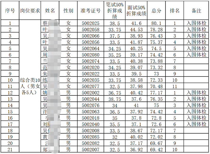 庆元农商银行2020年新员工招聘成绩及入围体检人员名单(公示)