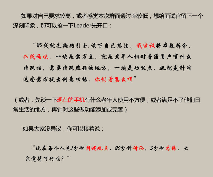 还可以做“记录总结员”,把大家姓名,想法,清晰记录,再汇报给大家供讨论筛选。最后汇集的答案写清楚或者说清楚,交给leader/自己向面试官汇报。