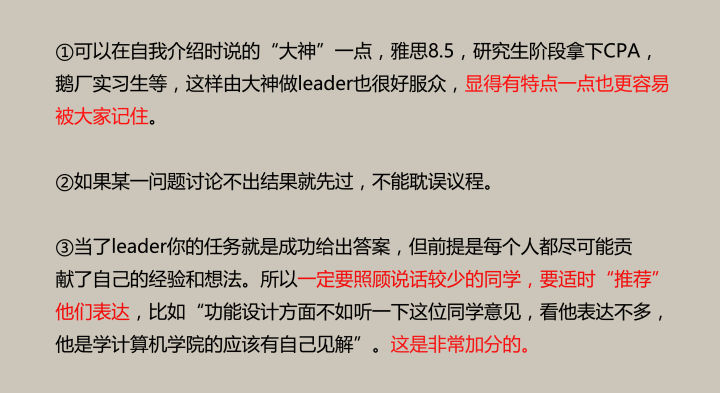 群面更多是【筛除】,所以只要能够贡献力量、贡献创意,只要对讨论进程有贡献都能顺利通过,没必要非当leader。