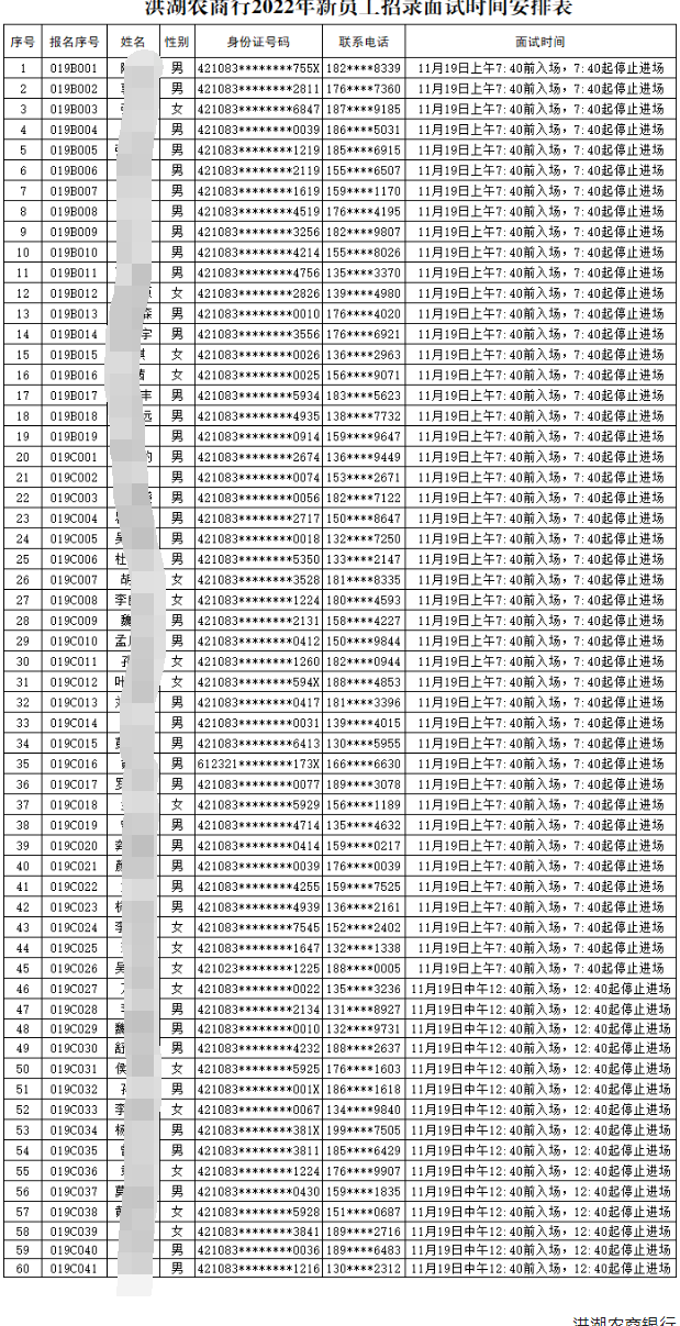 洪湖农商银行2022年新员工招录面试工作定于11月19日。每位考生参加面试的具体时间根据考生参加资格审查时间予以确定(详见附件)。